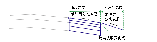 在布局模式中,此部件将基于提供的输入参数,显示包括用于正常拱形路面情形的路肩的连接。如果给定的“铺装百分比坡度”是数字值,将基于该值计算路肩的铺装部分。否则,将使用默认坡度值 -6%。