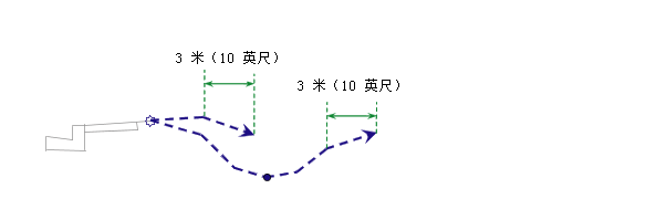在布局模式中,此部件以虚线显示挖方和填方条件的平缓坡度解决方案。边坡连接沿水平方向向外延伸 3 米(10 英尺),并以箭头结束。