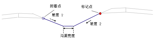 附着点和标记点的位置是确定的。标记点既可以位于附着点的右侧,也可以位于其左侧。将连接从附着点沿坡度 1 向内延伸,从标记点沿坡度 2 处向内延伸,直到它们相交。如果给定了沟渠宽度,那么与相交边坡匹配的是水平沟渠底部连接。