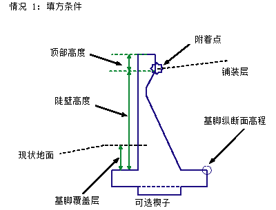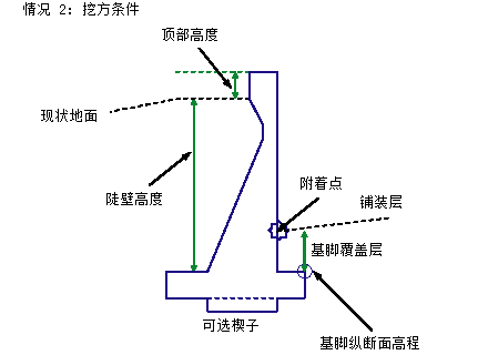 附着点根据护墙处于挖方条件还是填方条件而有所不同。如果其处于填方条件,则附着点将位于护墙顶部附近。在挖方条件下,附着点将位于基脚附近。
