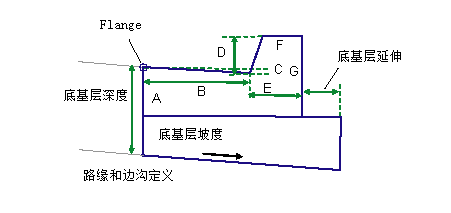 将基于输入参数“标注 A”到“标注 F”的标注插入所有其他路缘和边沟连接。所有标注都必须为非零的正值。如果给定非零的“底基层深度”,那么底基层将被插入到路缘后部,并延伸至“底基层延伸”宽度。底基层接近于路缘后部的底部,如图所示。