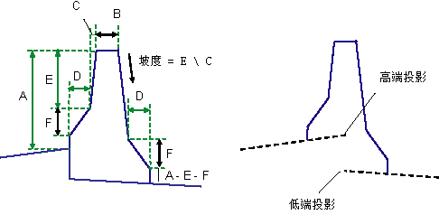 高侧上的挡墙底部偏移是通过给定的标注来计算的。高侧上的叠加层将从剪切点延伸到此偏移。