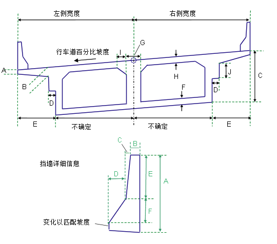 如果“包含挡墙”为真,将在左侧和右侧桥面边缘添加单面挡墙横断面。挡墙底部的坡度将调整,以匹配桥面坡度。