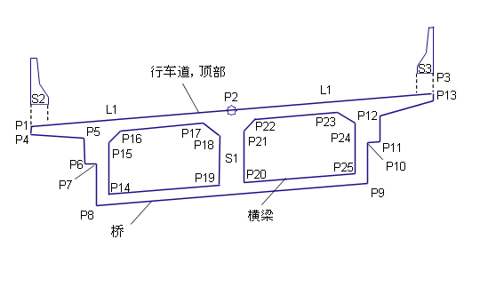 附着点位于桥面完工坡面上左右车道之间的分隔线上。桥梁横断面构建在左右两侧。