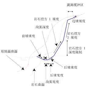 如果边坡不在岩石曲面下方,则将添加前坡、沟渠底部和后坡,并以给定的挖方坡度将挖方边坡连接从后坡端点延伸到边坡曲面。