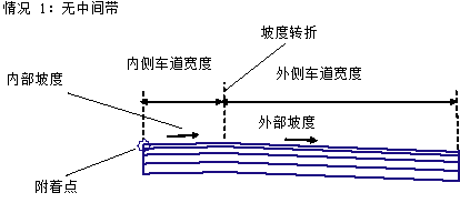 坡度转折:可以使用固定的数字宽度定义从附着点向外到位于内外侧车道之间的坡度转折的宽度,也可以使用路线替代宽度。通过在整个车道宽度范围内对内侧车道应用指定的坡度来决定坡度转折处的高程。