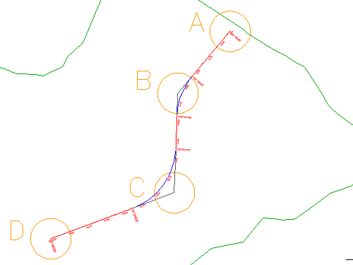 - 向圆外引出一条直线,再通过依次捕捉到圆 B、C 和 D 的中心来指定其他交点。然后,单击鼠标右键以结束平面路线布局命令。