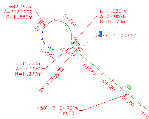 请注意,已选择“大街”和“东街”路线及其桩号标签。已选择这些标签,因为它们是在路线所在的外部参照图形中创建的标签。如果已通过外部参照创建对象,则您仅可在源图形中编辑其标签。