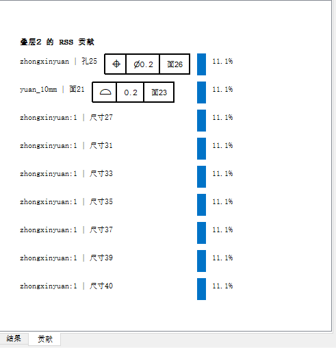 您可以通过选择表底部的“贡献”选项卡以显示贡献图来查看每个尺寸标注的贡献。该信息有助于您确定如果预测有太多变化应首先减小哪个公差。影响叠加及其相对贡献的尺寸标注和公差的列表按从大到小的顺序排序。