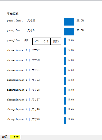 如果未选择“摘要”表中的任何叠加并且您选择了“贡献”选项卡,则该窗格将显示每个尺寸标注在所有定义的叠加中具有的贡献的汇总。
