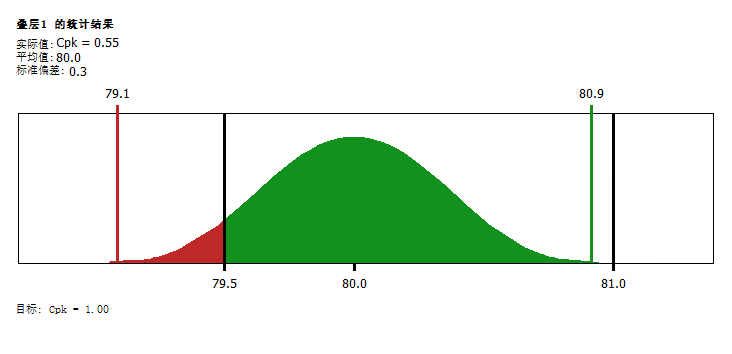 位于该图上方的数字表示上限和下限,还表示处于指定质量目标的叠加。该图位于规范极限范围内的区域以绿色显示,超出极限的区域以红色显示。