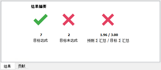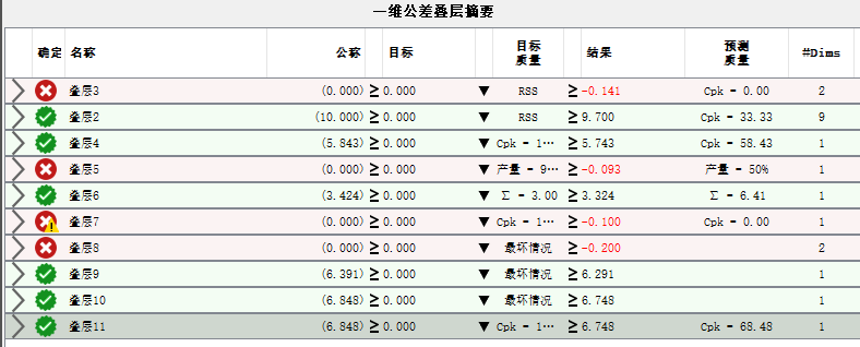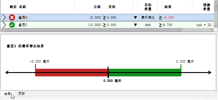在“公差分析”面板的底部是“结果”窗格。当存在多个叠加,但未选择任何叠加时,“结果”窗格会显示满足或不满足的目标数量摘要,以及使用“设置”中指定的首选质量指标的质量汇总。