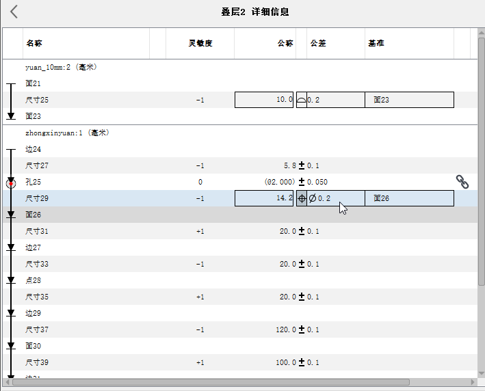当包含零件的一个或多个要素时,可以通过在表中上下拖动行,更改除第一个和最后一个要素外的所有要素的顺序,以反映不同的尺寸标注序列。当要素位于其他两个要素之间的尺寸标注之上时,释放该要素。当释放鼠标按钮时,Tolerance Analysis 会按照要素在表中的显示顺序在各要素之间创建尺寸标注。