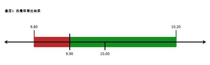 该图下方的数字表示公称叠加值,以及叠加的规范上限和下限,如“目标”中所定义。对于单向规范,例如结果必须大于 9.90 的情况,仅会显示一个规范极限。