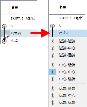 当位于该尺寸标注上方和下方的要素是尺寸要素时,将有多个选项。第一选项指示尺寸标注原点是应附着到位于该尺寸标注上方的要素的近端、中心还是远端。第二项目用于附着到位于尺寸标注下方的要素。如果仅一个要素为尺寸要素,则列表中仅有三个选项。