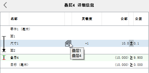 完成零件环定义后,Tolerance Analysis 会显示零件上选定要素之间的尺寸标注,并在“叠加详细信息”面板中创建初步的叠加分析表。