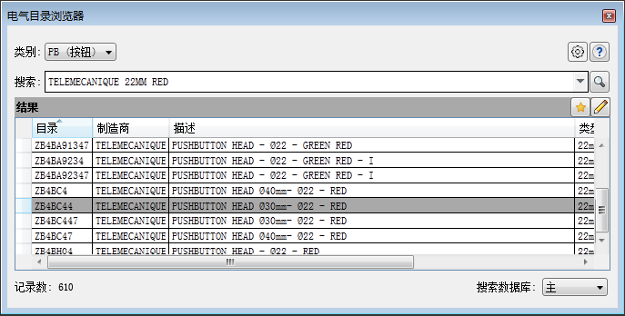 在电气目录浏览器中单击目录值,一个小选项板将会显示。如果有任何零件关联到该目录值,则这些零件会显示在该选项板上。
