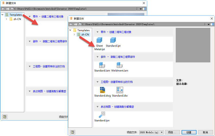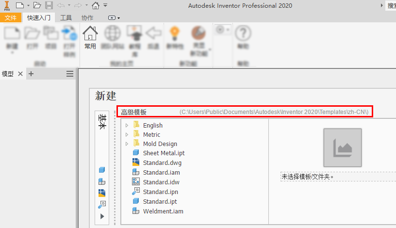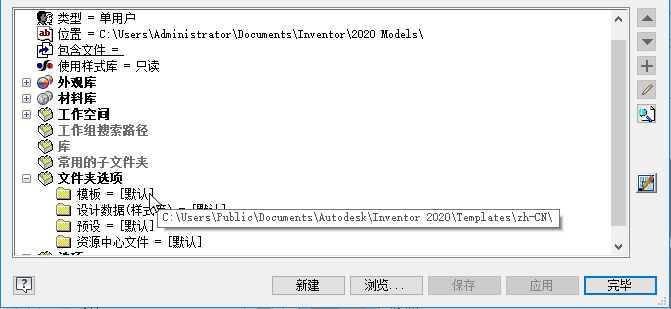 在 Inventor 2020 中,所有语言包均以相同的方式安装和处理。默认安装路径为 C:\Users\Public\Documents\Autodesk\Inventor 2020\Templates\%Language%。更改语言时,Inventor 会自动更新模板路径以使用相应语言的已安装模板。