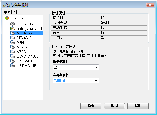通过“拆分”,您可以在拆分及合并地理空间要素时设置指定特性的规则。您可以对这些规则使用表达式。