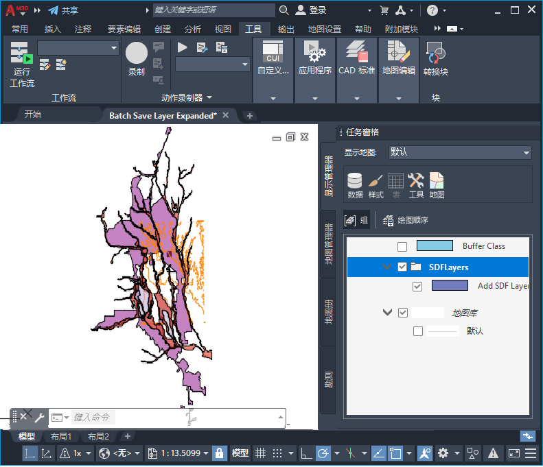 运行工作流时,AutoCAD Map 3D 工具集 会列出指定文件夹中的 SDF 文件。然后,将创建“显示管理器”组以容纳所创建的图层。它将连接到指定文件夹中的 SDF 文件。对于指定文件夹中的每个图形,该程序都会执行连接,将图层添加到“显示管理器”中并将图层移至新组。