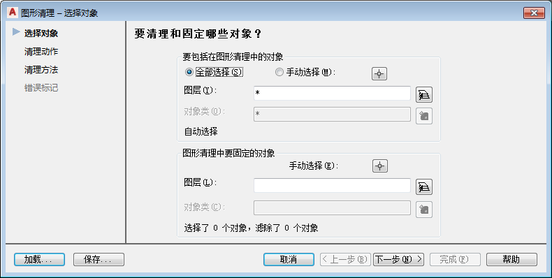 - 在“图形清理 – 选择对象”对话框中,执行以下操作: