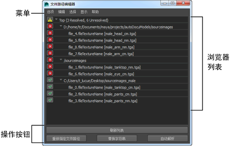 “文件路径编辑器”(File Path Editor)可用于快速而轻松地诊断并修复未解析的路径,允许您重新指定断开的纹理路径,如文件纹理编辑器。