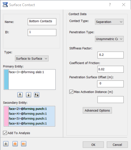 - 清除所有实体,然后重新选择“主实体”作为板坯的下表面,选择“次实体”作为冲床模型的所有接触面,如下图所示。确认“穿透类型”、“刚度因子”和“摩擦系数”的值与用于“顶部接触”的值相同。