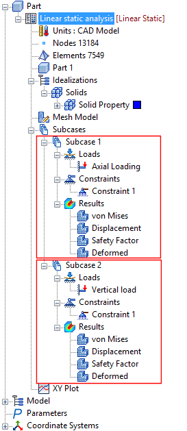 上面的示例有两个子工况,它们具有相同约束,但具有两种不同的载荷类型。可同时针对这两种载荷工况对此分析求解。