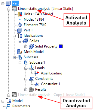 可通过在单击模型树中的分析节点时显示的关联菜单来访问“激活”命令。使用此命令可以使以前定义的任一分析当前处于活动状态。激活的分析将展开,而其他所有分析分支将折叠,并且其标题(顶部节点)将灰显。当分析处于非活动状态时,“激活”是关联菜单中唯一可用命令。