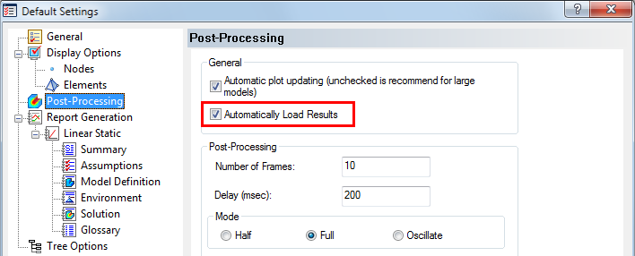 Inventor Nastran 支持在进入 Inventor Nastran 环境后自动加载先前求解模型的结果。若要启用该选项,请选中“默认设置”对话框的后处理部分中的“自动加载结果”框,如下图所示。然后,当进入 Inventor Nastran 环境时,可用结果将立即加载并可供查看。