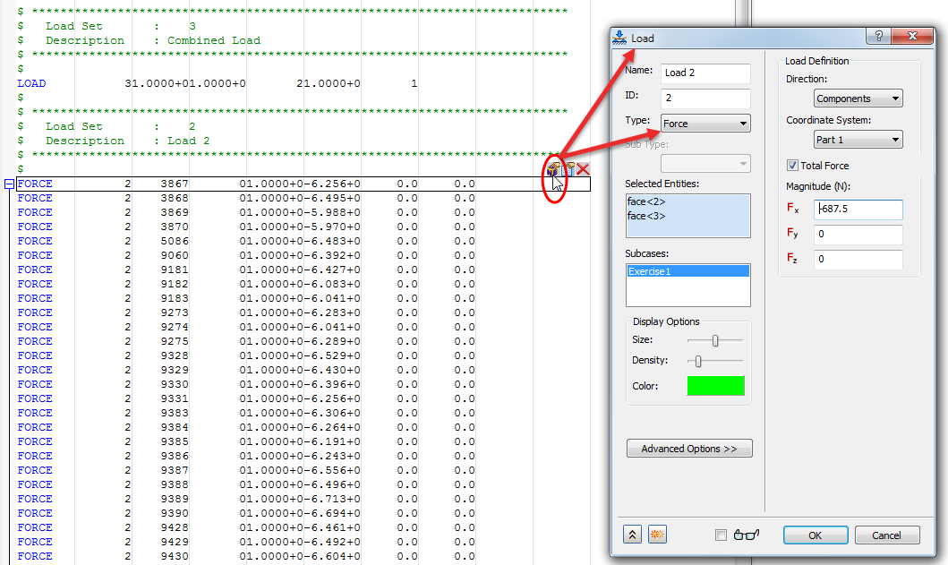 可以从批量数据文件的其他项跳转到已创建项的程序部分或对话框。例如,在 Nastran 文件中选择力载荷并单击最左侧的图标,该图标显示在“力”卡的右侧。将出现一个“载荷”对话框(其中显示选定的力),您可以根据需要编辑载荷。