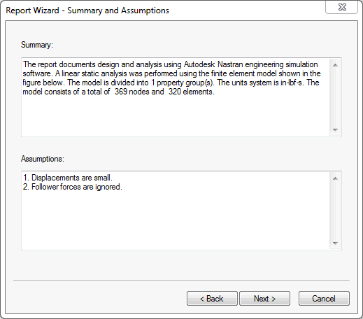 此时显示“报告向导 – 摘要和假设”窗口。编辑并添加所需的信息,然后单击“下一步 >”。