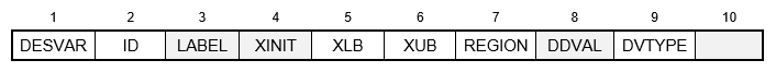 | DDVAL | DDVAL entry identification number that provides a set of allowable discrete values. | Integer > 0 or blank | See Remark 3 |