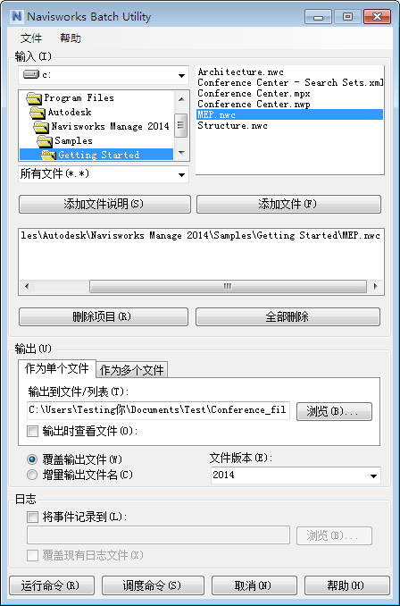 在“Navisworks Batch Utility”对话框中,使用“输入”区域来创建要转换的设计文件列表: