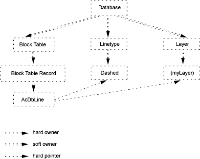 For example, in the following figure, the double lines indicate ownership references. If you follow the double lines, you touch every object in this small database only once. If you also follow the single lines, which represent pointer references, you touch some objects more than once, because multiple objects can point to the same object. To obtain the full “definition” of the AcDbLine object, you would need to follow all the hard references, both ownership and pointer (that is, both the single and double solid lines).