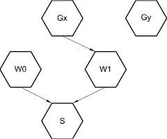 In the circle example introduced in Evaluation of Interobject Relationships, the application could represent the X and Y coordinate values of the grip as nodes in a graph (Gx and Gy). The width parameter might be represented by two nodes for the endpoints (W0 and W1). Finally, the scale action (S) might be represented by a single node. The resulting graph resembles the following figure: