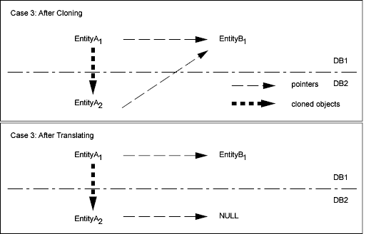 Case 3 is similar to Case 2, except the cloned objects are in a new database. In this case, the pointer reference of Entity A 2 is set to NULL, because Entity B 1 is not in the new database.