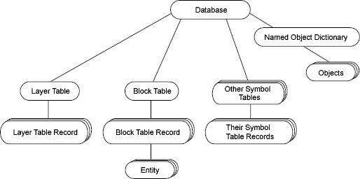 The following figure shows the key components of the AutoCAD database.