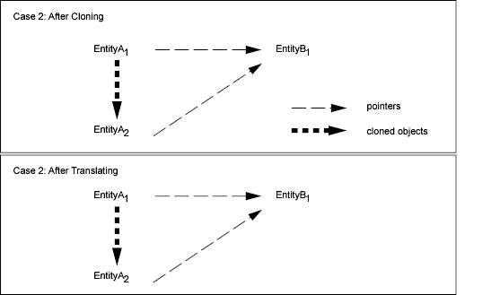 As an example of Case 2, suppose you have the same two entities: Entity A 1 contains a pointer reference to Entity B 1 . Entity A 1 is cloned, but Entity B 1 is not. The source and destination (cloned) objects are in the same database.