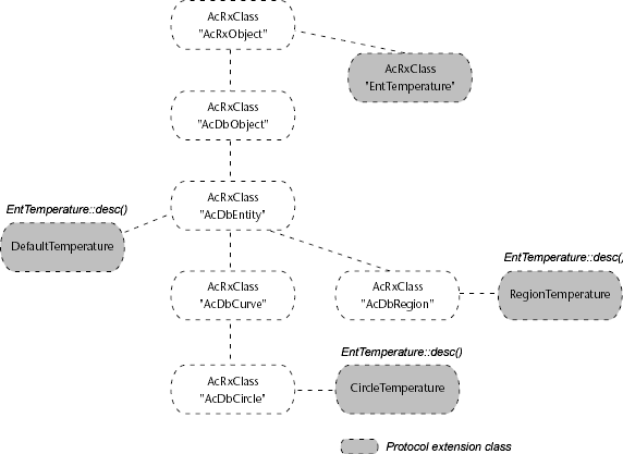 At runtime, ObjectARX constructs a class descriptor object structure that includes the basic ObjectARX class hierarchy as well as the protocol extension objects associated with the ObjectARX class descriptor objects. The following figure shows the class descriptor object structure for the classes that relate to the AsdkEntTemperature example in this section: