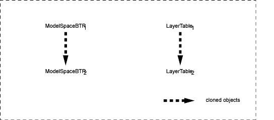 First, at the beginDeepClone() phase, the new database is created and set up with the default elements. The following figure shows the model space block table record and the layer table, because they're relevant to this topic. The cloning that occurs at this stage always happens during a wblock operation.