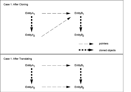 As an example of Case 1, suppose you have Entity A 1 , which contains a pointer reference to Entity B 1 . Both Entity A 1 and Entity B 1 are selected to be cloned. Before translation, Entity A 2 still refers to Entity B 1 . After translation, Entity A 2 is updated to refer to Entity B 2 .