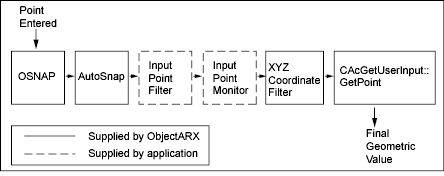 The following diagram shows how input point filtering and monitoring fit into the ObjectARX input processing model: