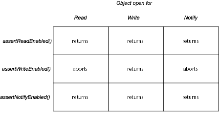 The following table shows the three possible states for opening an object (read, write, notify) and indicates which assert calls succeed for each state. If the object is not open in one of the allowed states for the assert function call, the function does not return. AutoCAD ® exits, and the user is prompted to save the drawing.