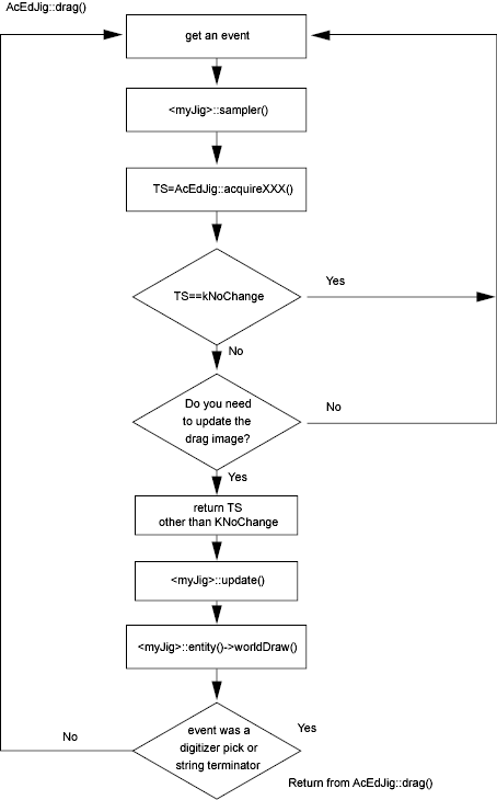 After you have set the display prompt for the drag sequence, you call the AcEdJig::drag() function, which performs the drag loop until the user presses Enter or the Spacebar, or picks with the pointing device. The following list describes the sequence of the drag loop: