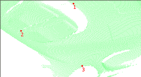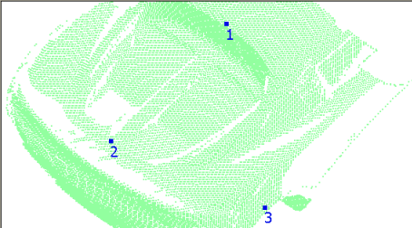 - 在第一个点云中,在要与第二个点云的重叠区域匹配的点上单击鼠标左键。选定点将显示为带编号的蓝色方块,以便您可以确定它们的选择顺序。必须至少拾取三个点。例如: