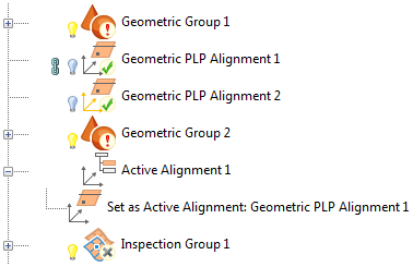 在本示例中,激活对齐定位最初设置为“几何 PLP 对齐定位 2”(由金色对齐定位图标指示)。当运行“激活对齐定位 1”项目时,它会将激活对齐定位重设为“几何 PLP 对齐定位 1”: