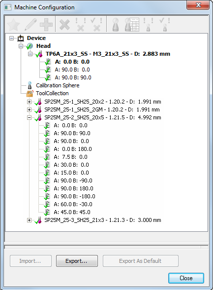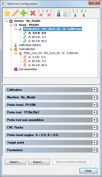 若要查看和管理测头数据库并显示 CMM 的校准详细信息,请单击“工具”选项卡 >“测量设备”面板 >“测头”。正在使用的测头及其当前校准的详细信息将显示在“测量设备配置”对话框中。