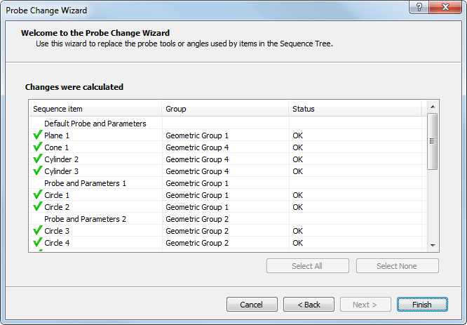 - 单击“下一步”。向导会列出使用当前探针工具的测头和参数项目,以及受更改影响的探测项目。