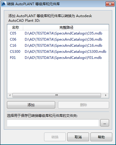 - 在“转换 AutoPLANT 等级库和元件库”对话框中,单击“添加”。